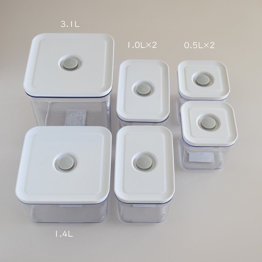0.5Lと1.0Lは冷蔵庫にも保存しやすいサイズで、真空ポンプで空気を抜くのも短時間で済むので、個人的には小さいコンテナが便利に感じてます。