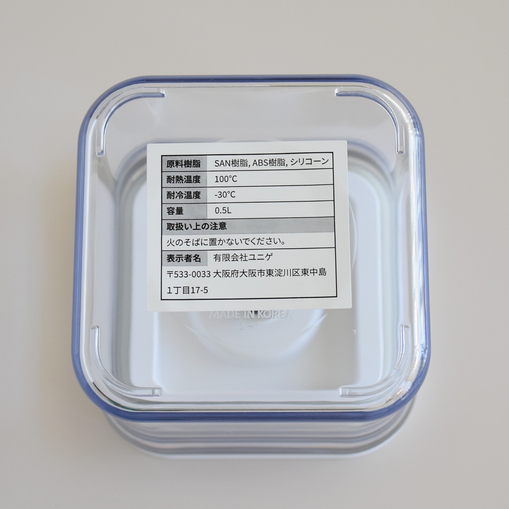 コンテナの材質はSAN樹脂(プラスチック)、フタはABS樹脂(プラスチック)、シリコーン。
