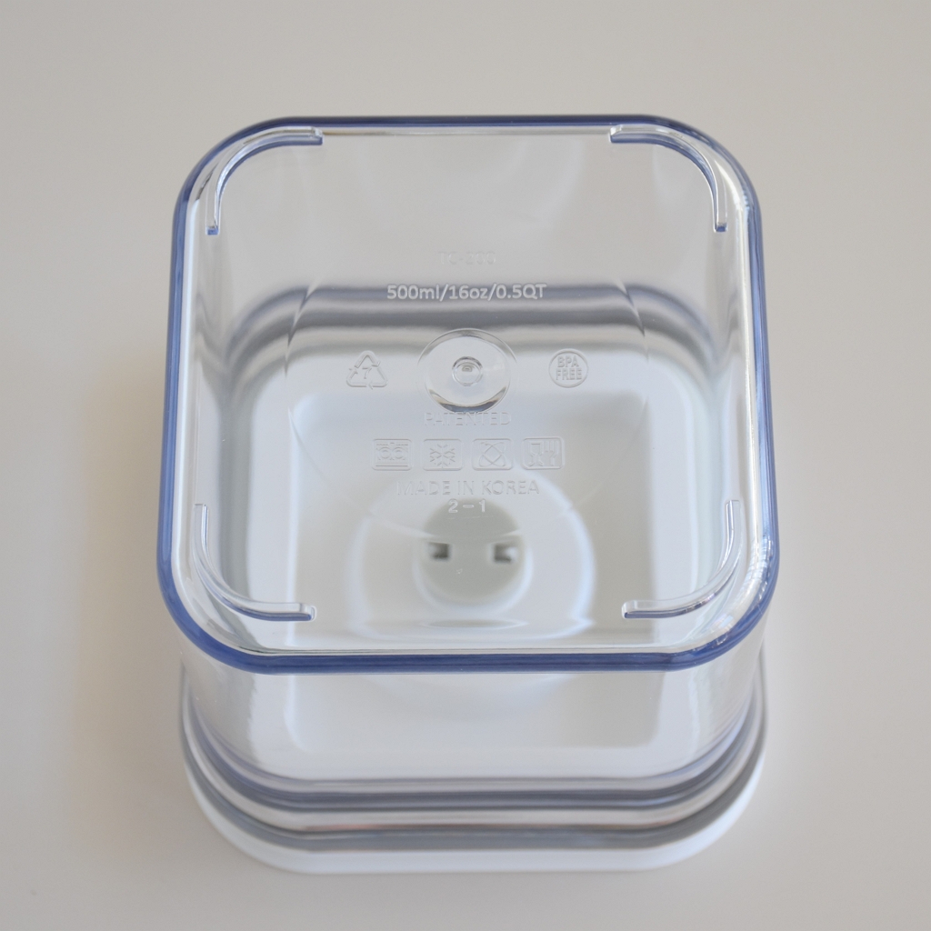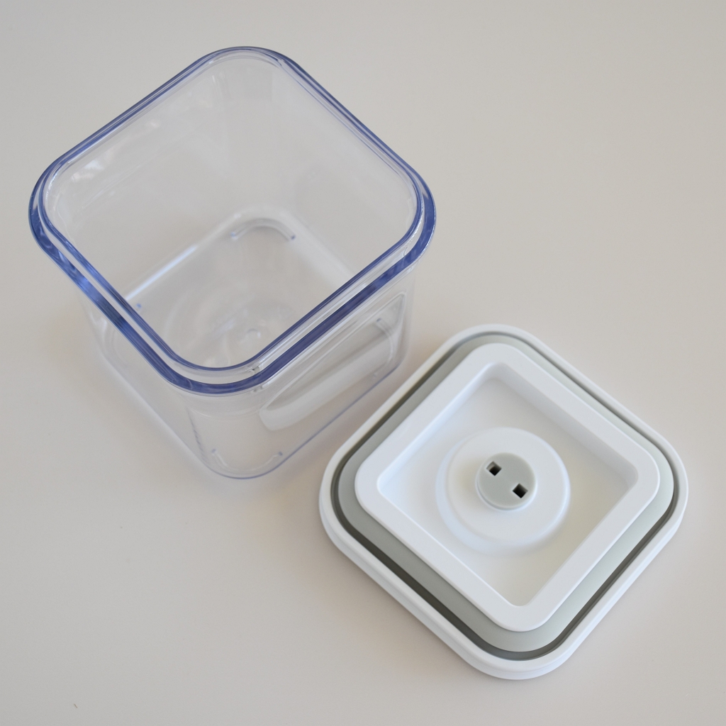 透明性の高いコンテナと、シリコーン製のバルブとパッキンの付いたフタ。