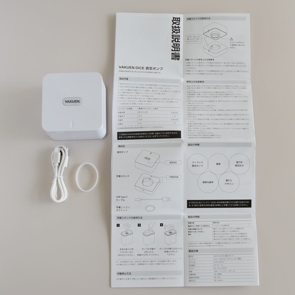 シリコンガスケットは真空ポンプに取り付ける予備、USB Type-C ケーブルは充電スタンドにさしこみ、真空ポンプの充電に使います。