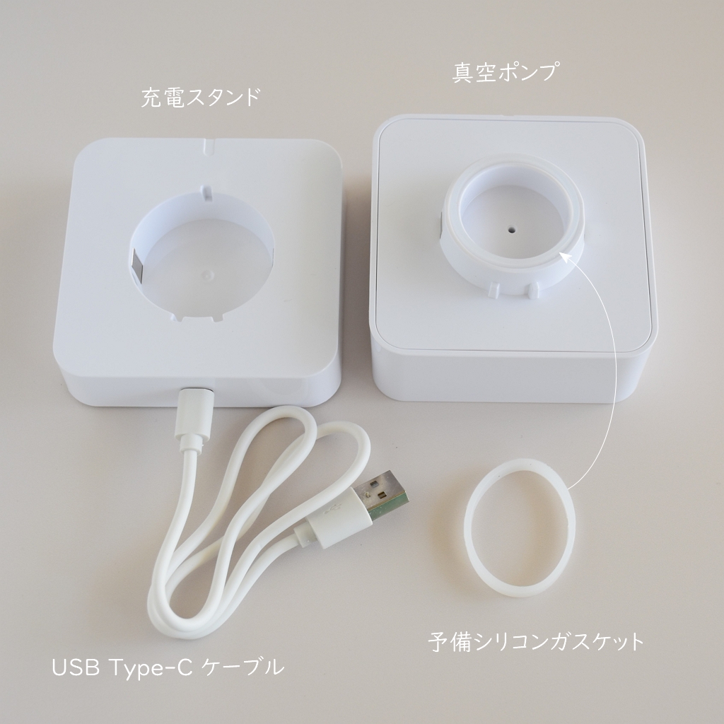 セット内容は、真空ポンプ、充電スタンド、USB Type-C ケーブル、予備シリコンガスケット。