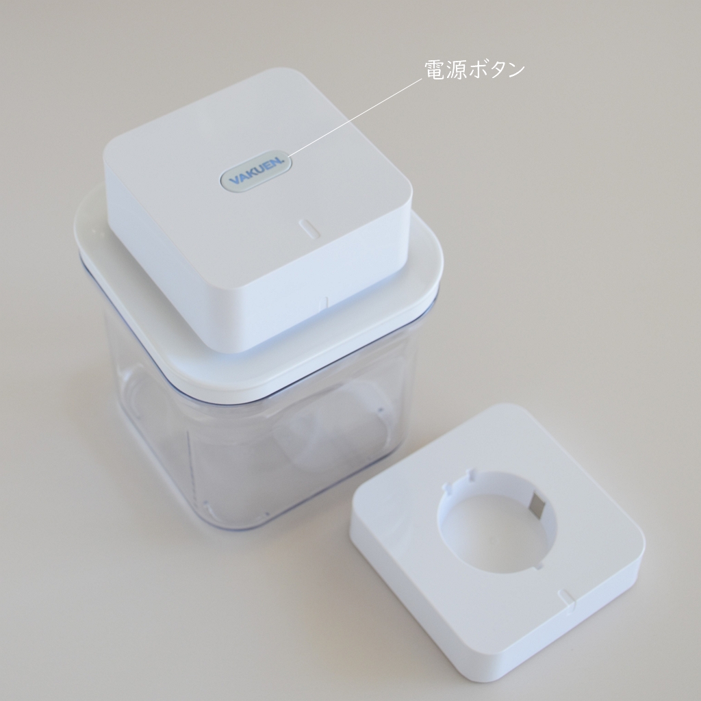 作動中は電源ボタンが点灯し、真空ポンプがコンテナから空気を吸い込みます。