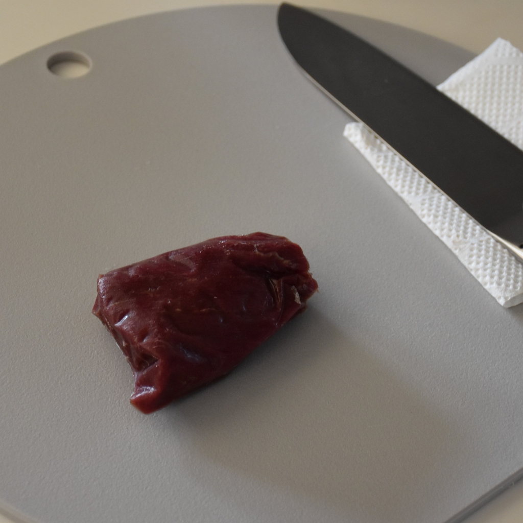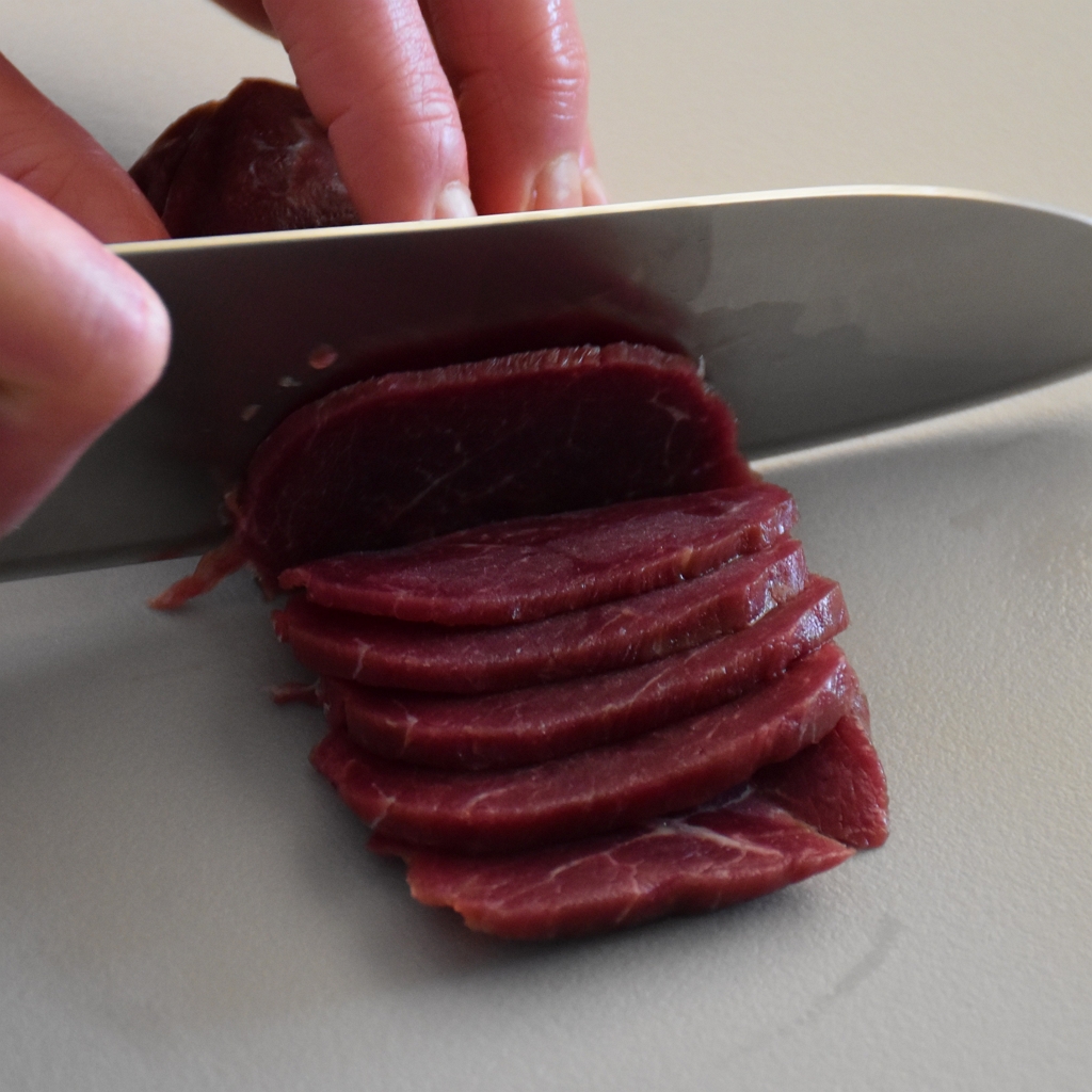 ・生肉のため厚めにカットしますと噛み切れなったり、食感が損なわれます。2~3mmにカットすることをおすすめします。