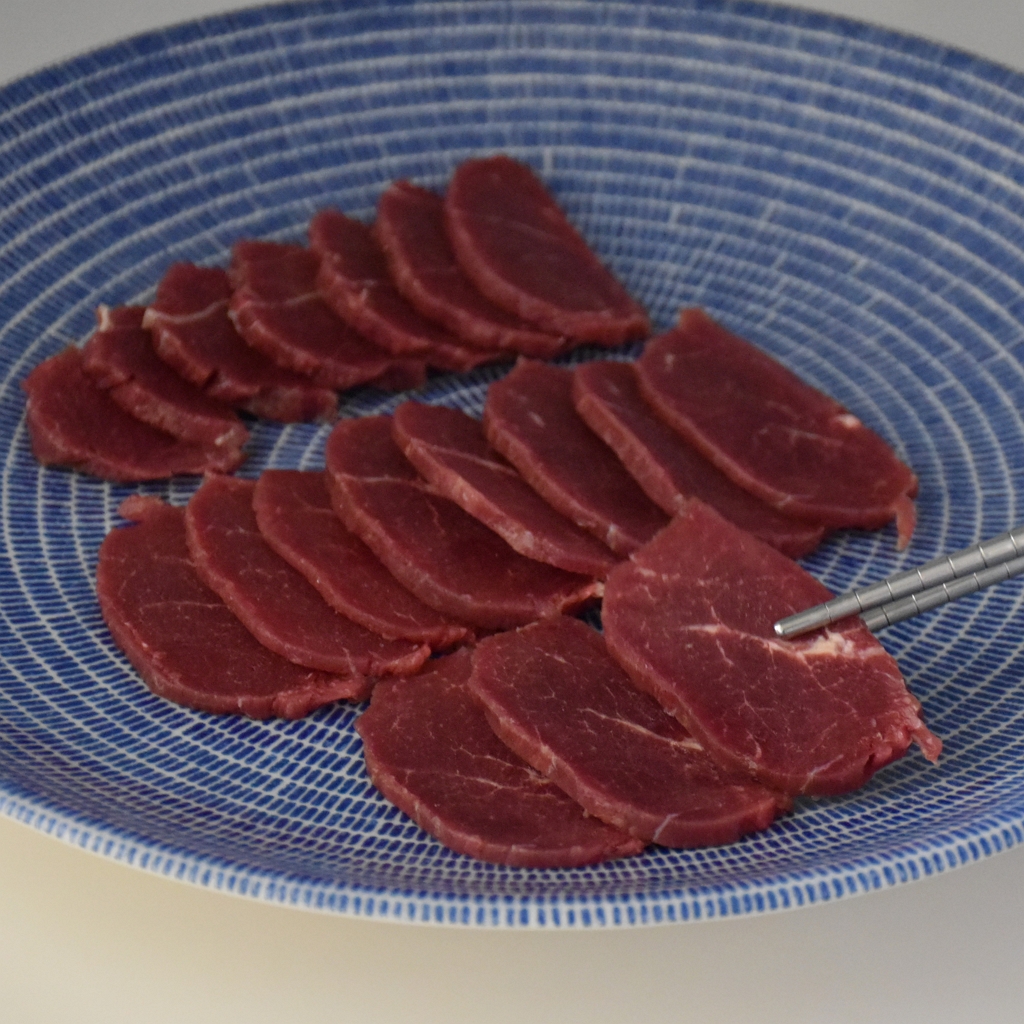 肉の繊維に沿って、2~3mmの厚さでカットして、お皿に盛り付けてください。(4)冷蔵庫に戻して全解凍