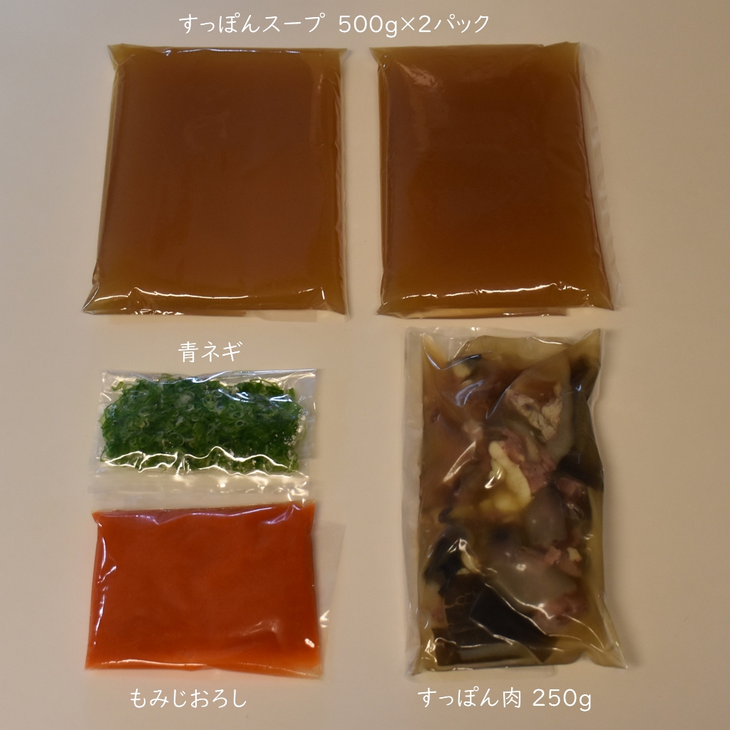 【お試しセット】の内容は、すっぽん肉250g、すっぽんスープ500g×2袋、もみじおろし、ネギ。