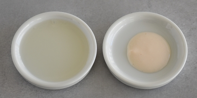 シャンプーはほんのり黄色い透明な液剤、トリートメントは薄いオレンジ色の乳白色の液剤。