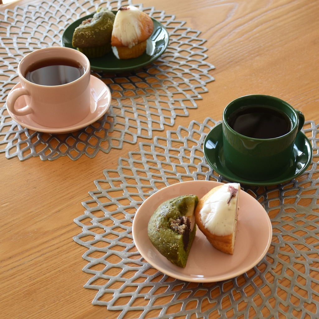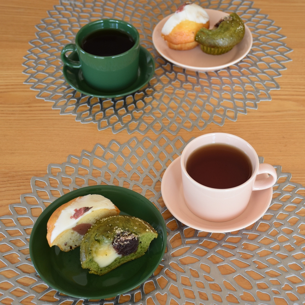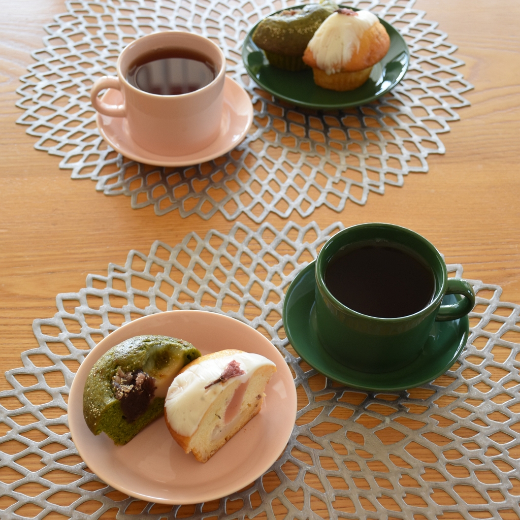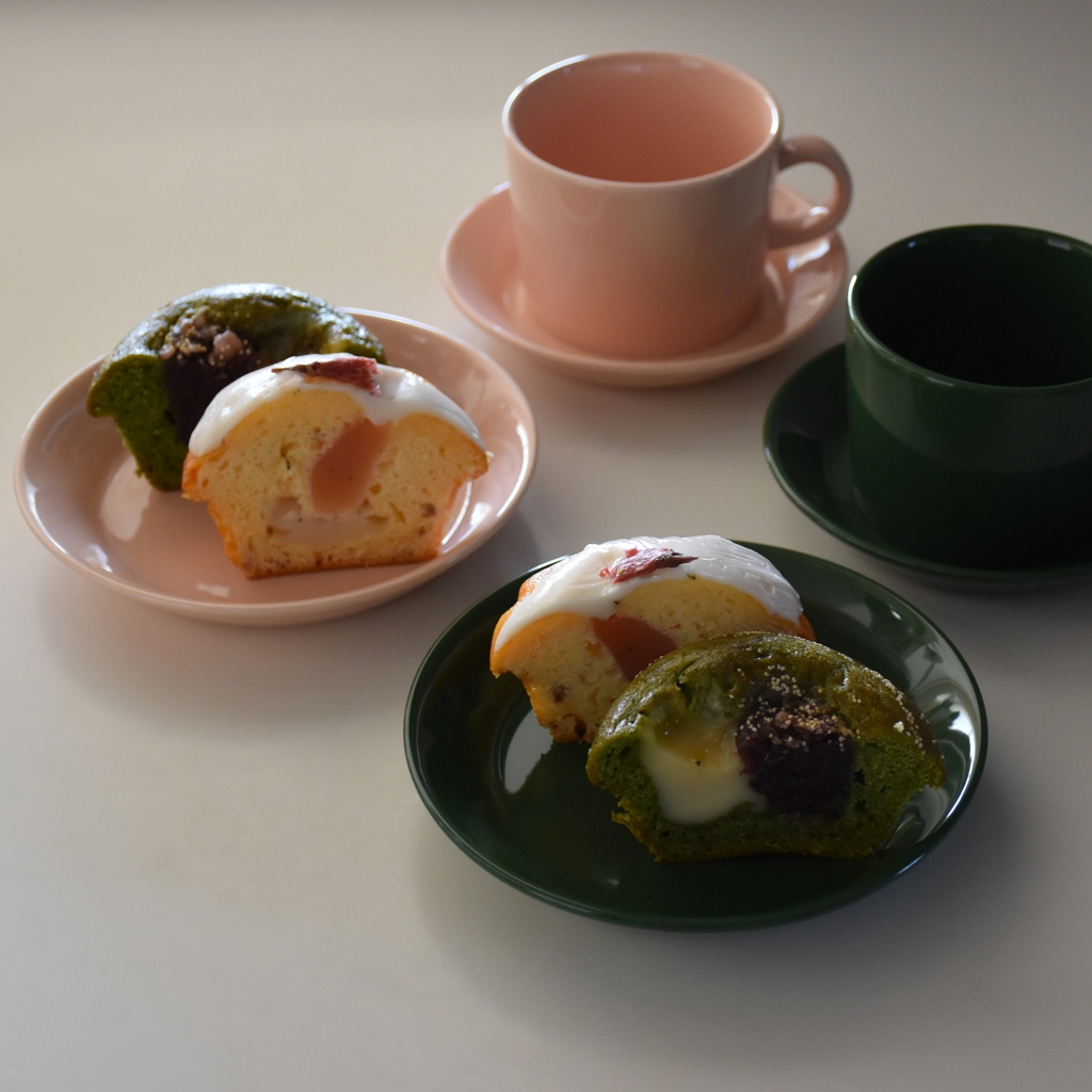 イッタラ ティーマ 2026年春夏シーズナルカラーの緑色の【ハンター】と、桜のようなピンク色が春らしい【パウダー】で春のスイーツを楽しみました。scope特注ティーカップ、プレート12cmと15cmを組み合わせ、春のティータイムコーディネイトの完成です。
