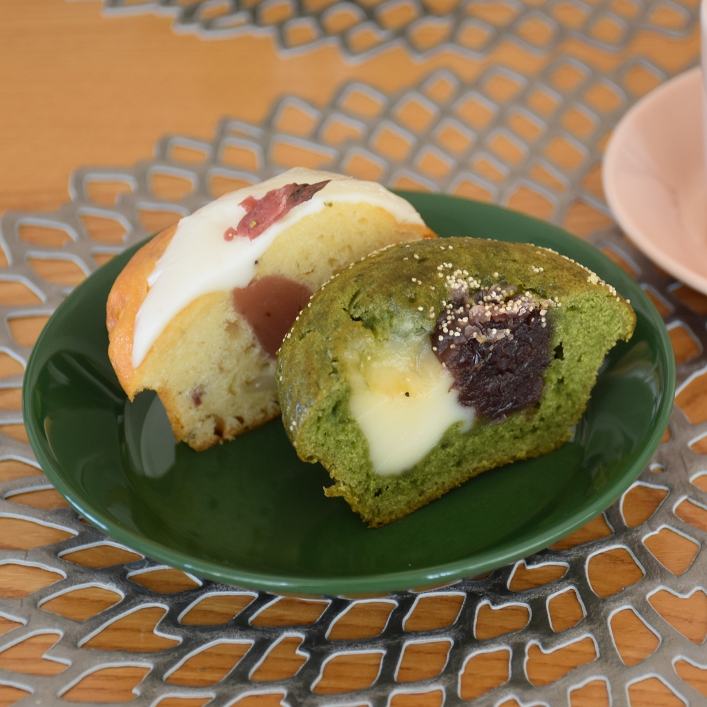【狭山抹茶とあずき豆乳クリーム】マフィンはネーミング通りに狭山抹茶の生地にあずきと豆乳クリーム。