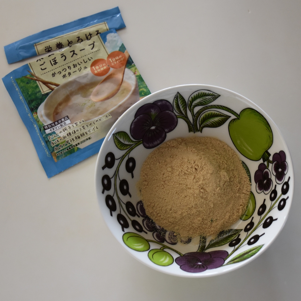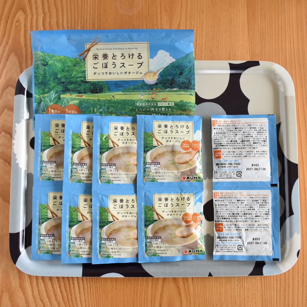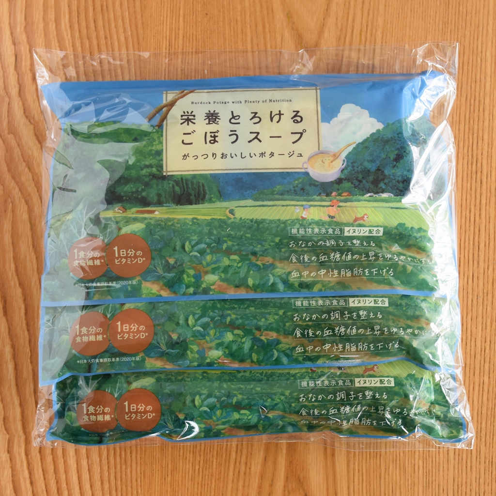 1袋で1食分の食物繊維と、1日分のビタミンDを摂れる【あじかん】さんの【栄養とろけるごぼうスープ】です。