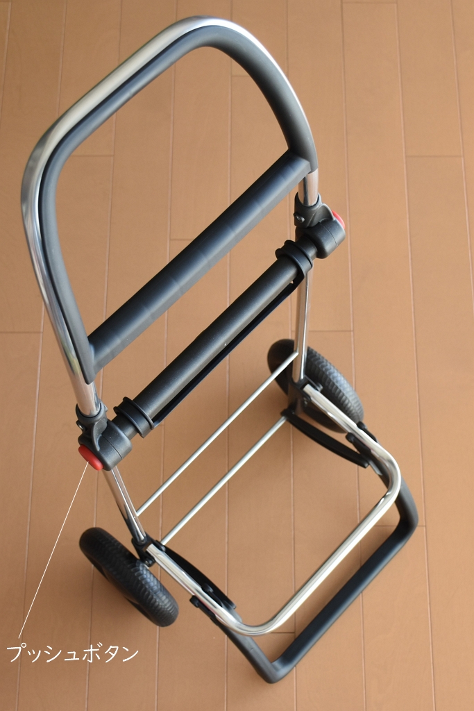 折りたたむときは、左右の赤いプッシュボタンを押しながらハンドルを倒す。
