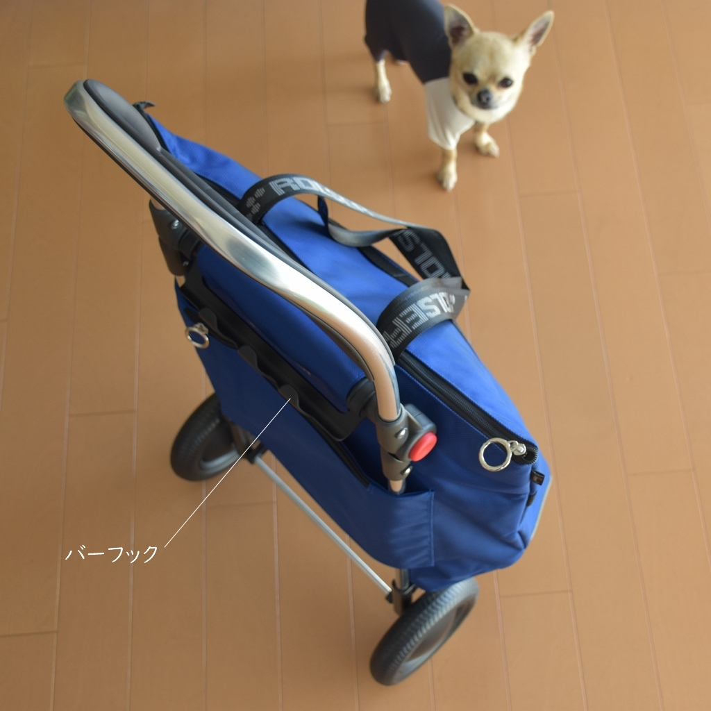 バーフックはサブバッグを掛けたり、フレームを折りたたみ、スーパー店内のカートにひっかけるときに使えます。