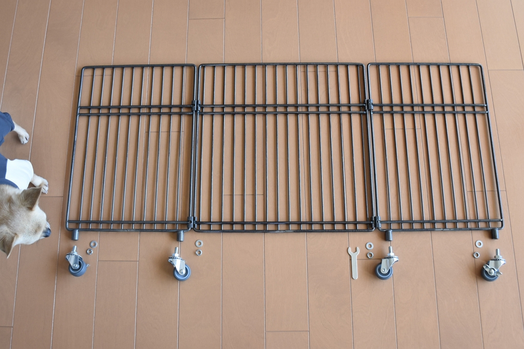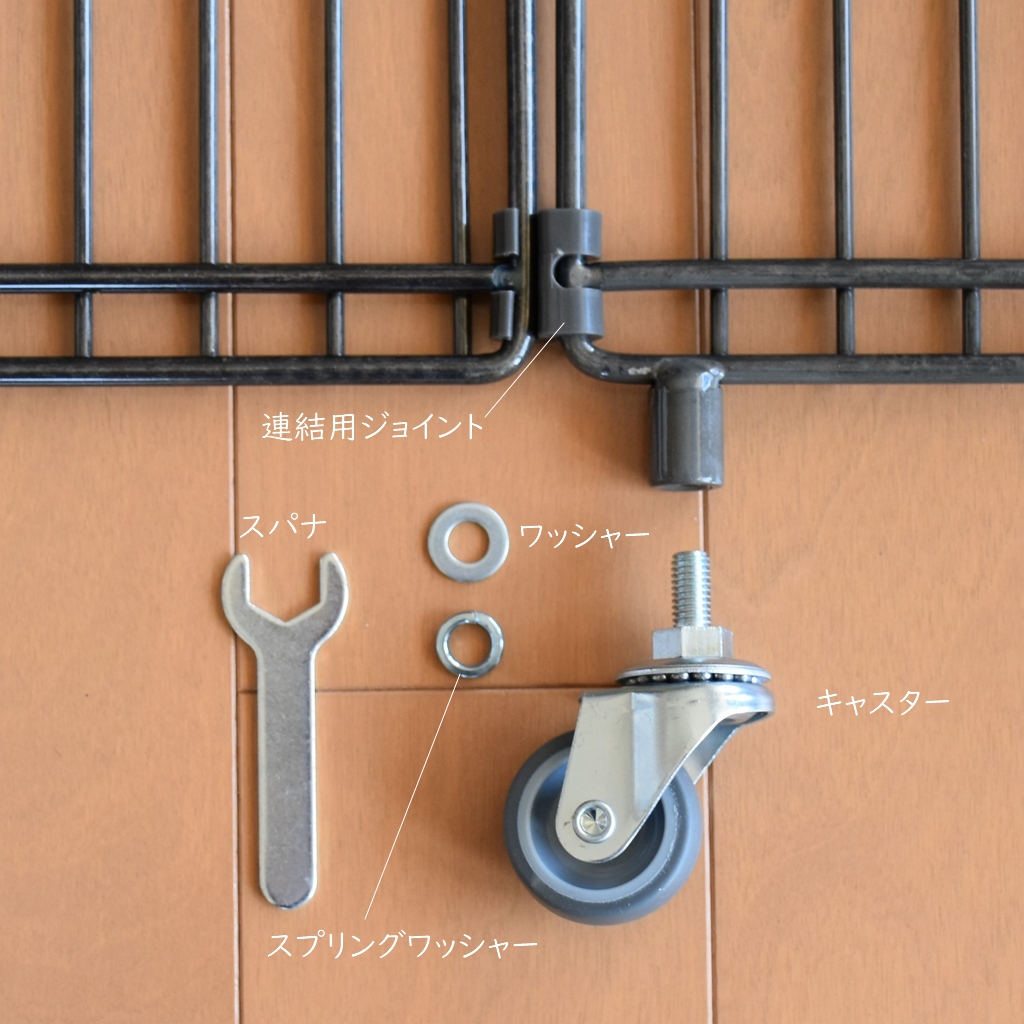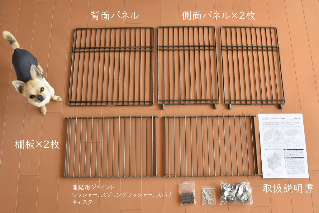 セット内容は、背面パネル×1、側面パネル×2、棚板×2、連結用ジョイント×6(予備×2含む)、スパナ、ワッシャー×4、スプリングワッシャー×4、キャスター(ストッパー付き×2、ストッパーなし×2)、取扱説明書。
