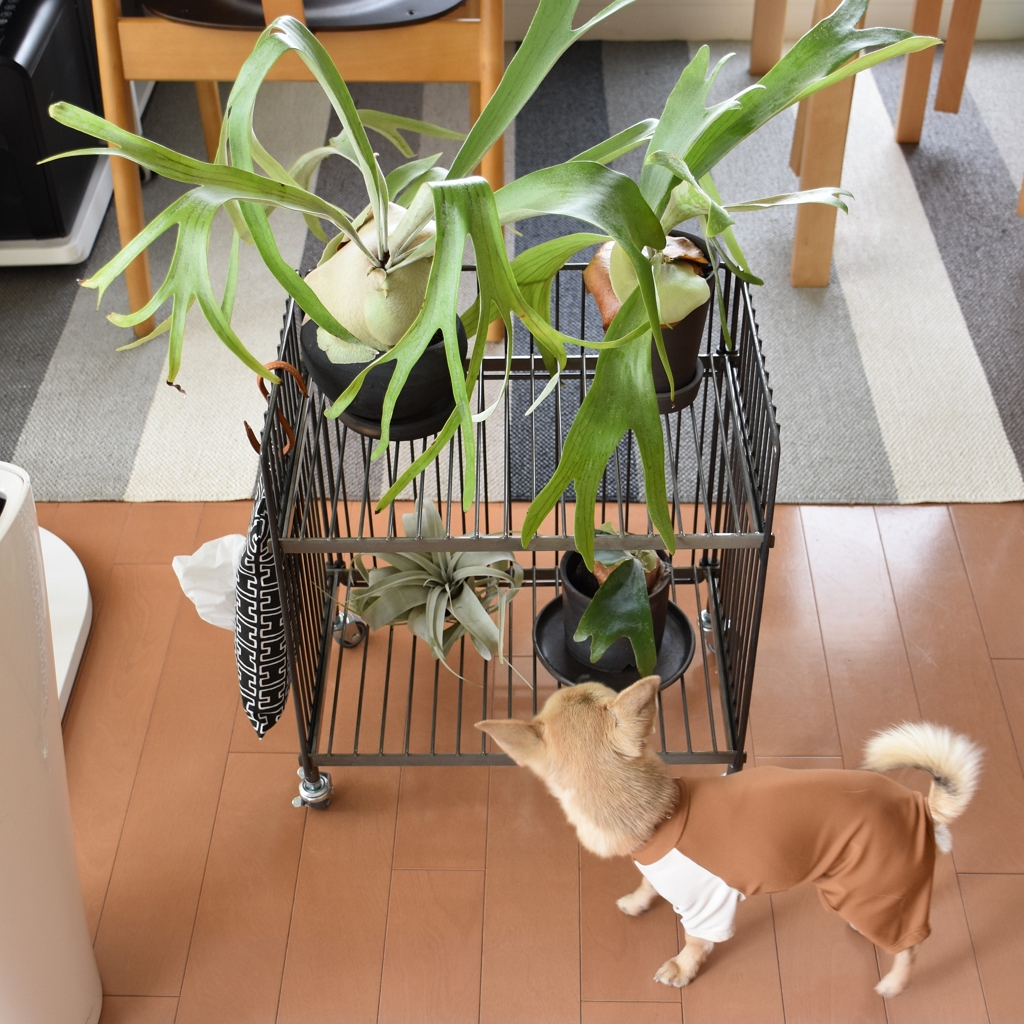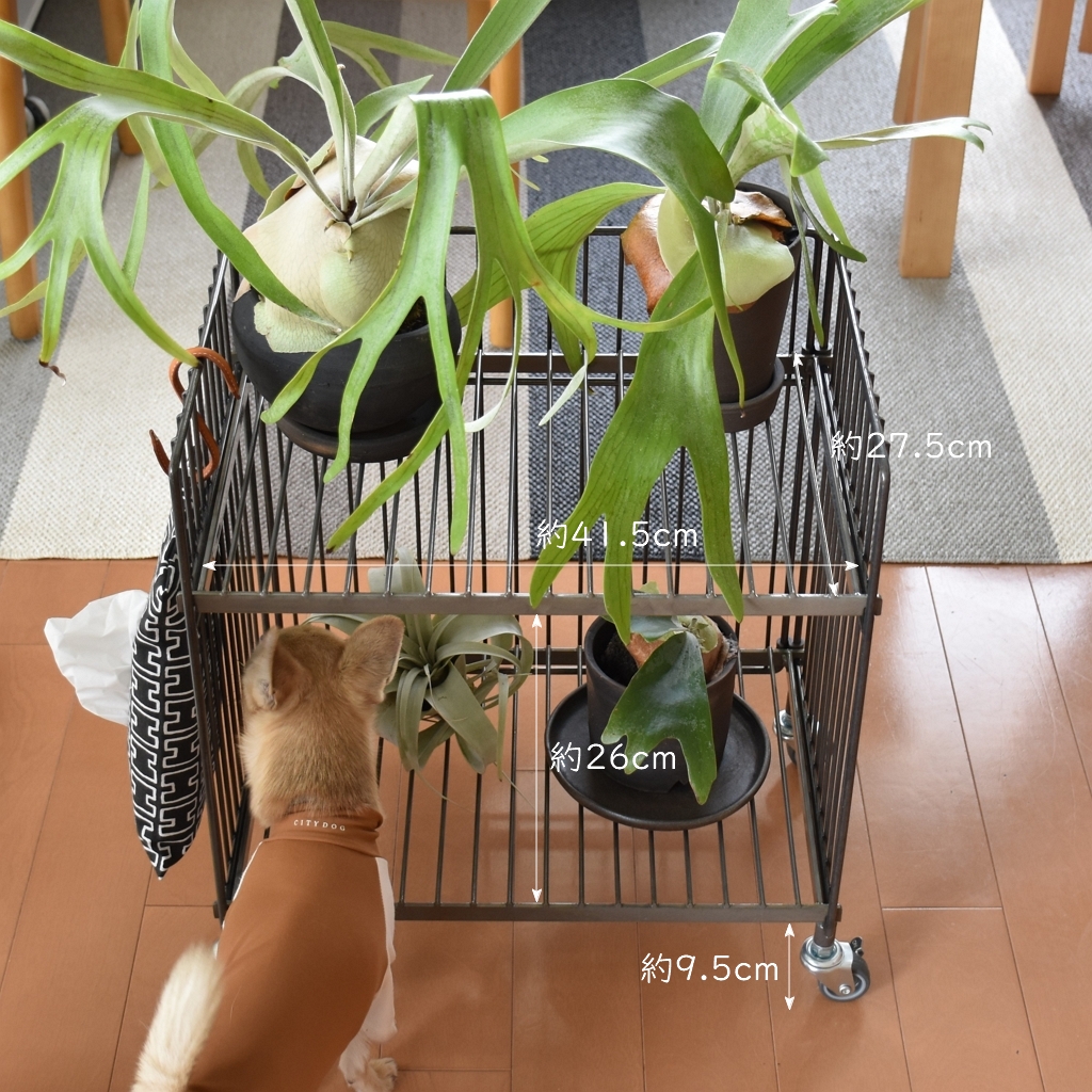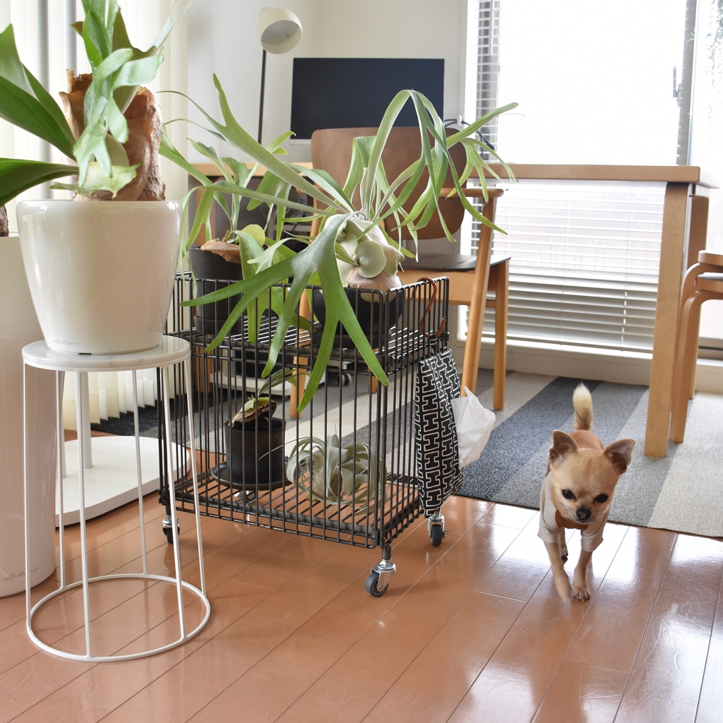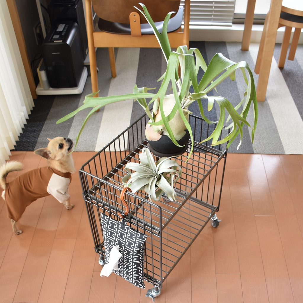 鉄ならではの重厚感、耐久性、機能性を備えた、無機質でインダストリアルな雰囲気が魅力のシリーズ【COLLEND WIRE WORKS】のワイヤーワゴンに植物を載せました。圧迫感を感じにくく、空間をスッキリ見せてくれるワイヤーワゴン。エラストマー製のキャスターはスムーズに気持ちよく動き、簡単に移動できるからお掃除もしやすいです。